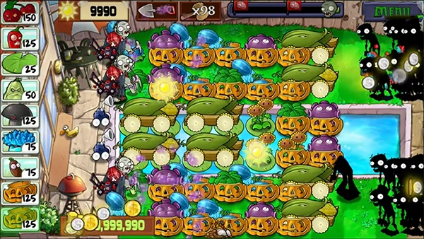 6、火力全开:在第一排先种植一个玉米大炮,然后其余的就种植四发豌豆射手,哪怕僵尸的能力再强都没有办法越过这钟火力全开的阵型。