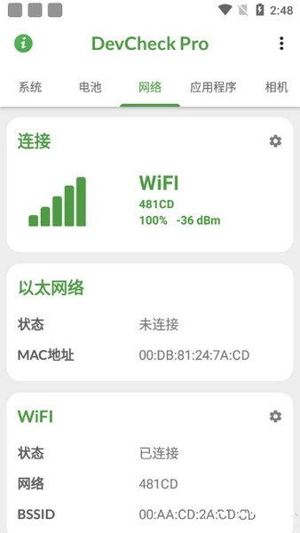 3、这款软件虽然很小,但是它的信息却很丰富,包括摄像头、系统、网络、电池等各种信息。