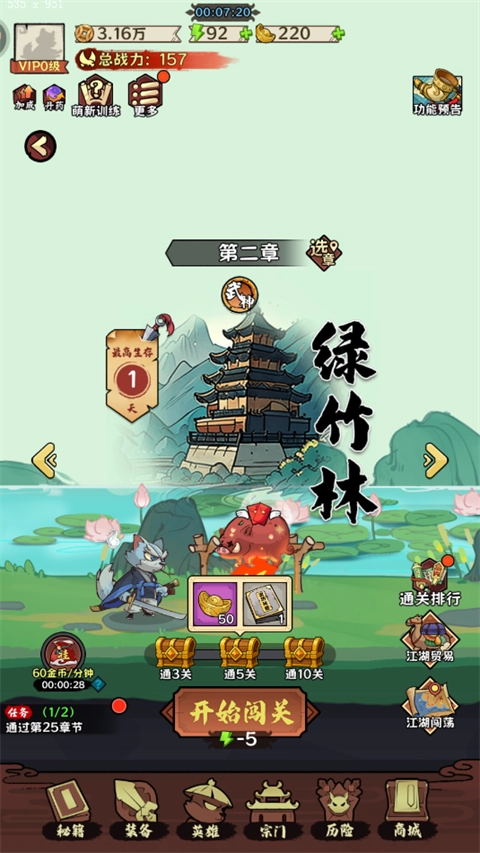 1. 在闯关、扫荡、挂机以及商城抽奖过程中,均有机会获取武功秘籍。