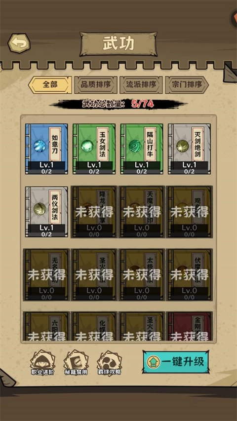 3、只有已解锁的武功,才有机会在闯关时出现,可以在大厅秘籍界面里查看自己已解锁的所有武功。