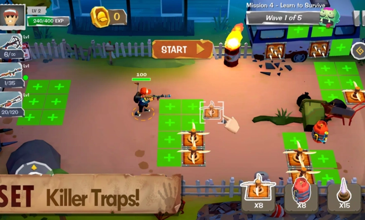 在僵尸来袭前设置陷阱并选择最佳武器。