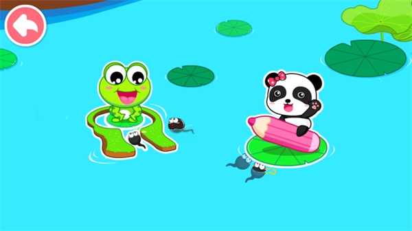 2、画一画:小蝌蚪长什么样?青蛙妈妈长什么样?还有金鱼、螃蟹、乌龟、熊猫,你还记得他们的样子吗?没关系,“画一画”中教你用简单的线条画出他们,还可以把他们放到池塘里哦。