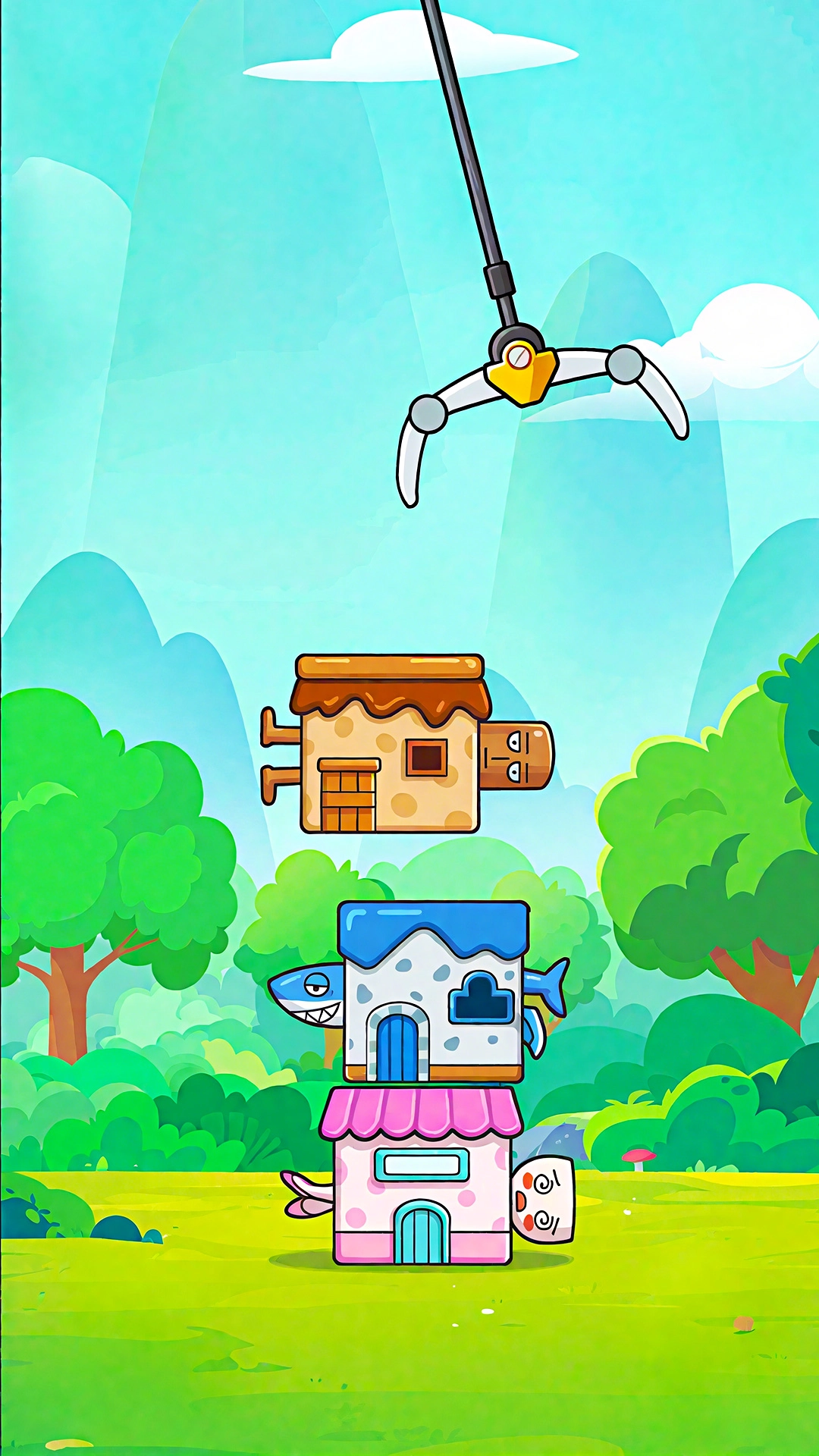 1、操控大爪子抓取不同造型的小屋,精准放置在已有塔层上,努力让塔保持平衡并不断增高。