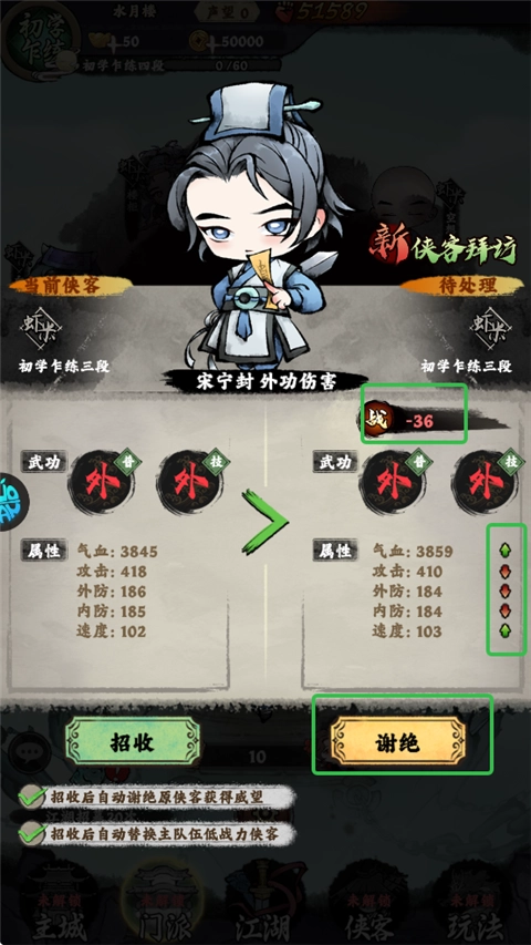 4、新侠客比原侠客战力低、资质差的,点击谢绝,不进行招收。