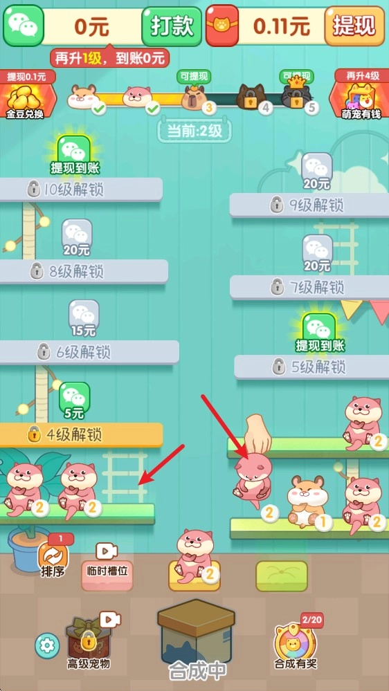 2、当一排凑齐三个相同的宠物时就会自动合成,得到更高等级的宠物。
