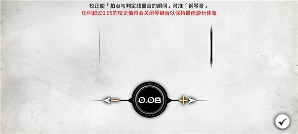 4、通过点击“-”和“+”进行校正,使拍点与判定线重合的瞬间对准钢琴音;调整完成后点击右下角的“√”;