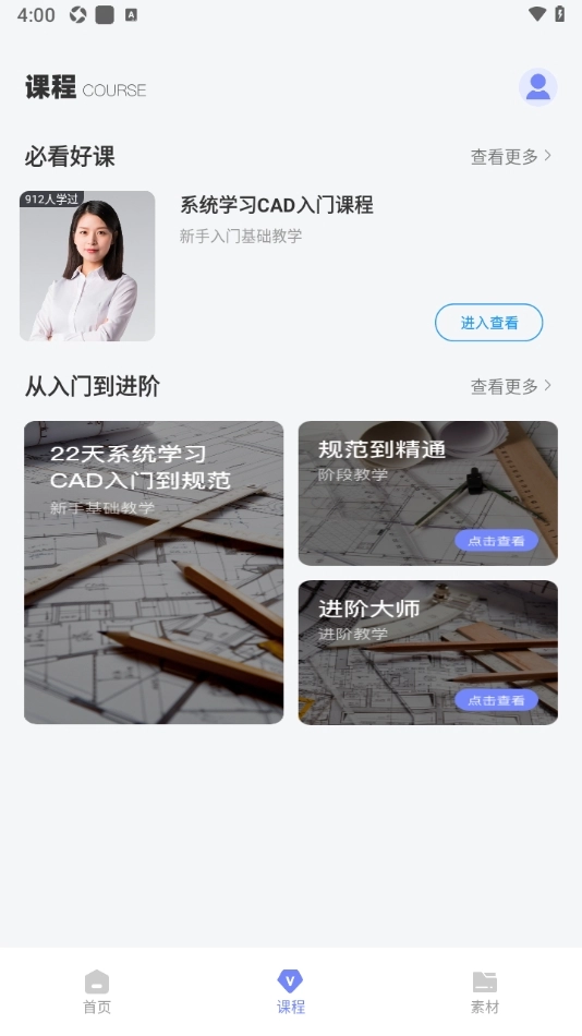 2、还加入了CAD课程教学内容,可以让大家从入门开始学习,一直到进阶版本的课程全都包含,此外还有推荐好课,让大家看图纸的同时能够不断的学习成长!