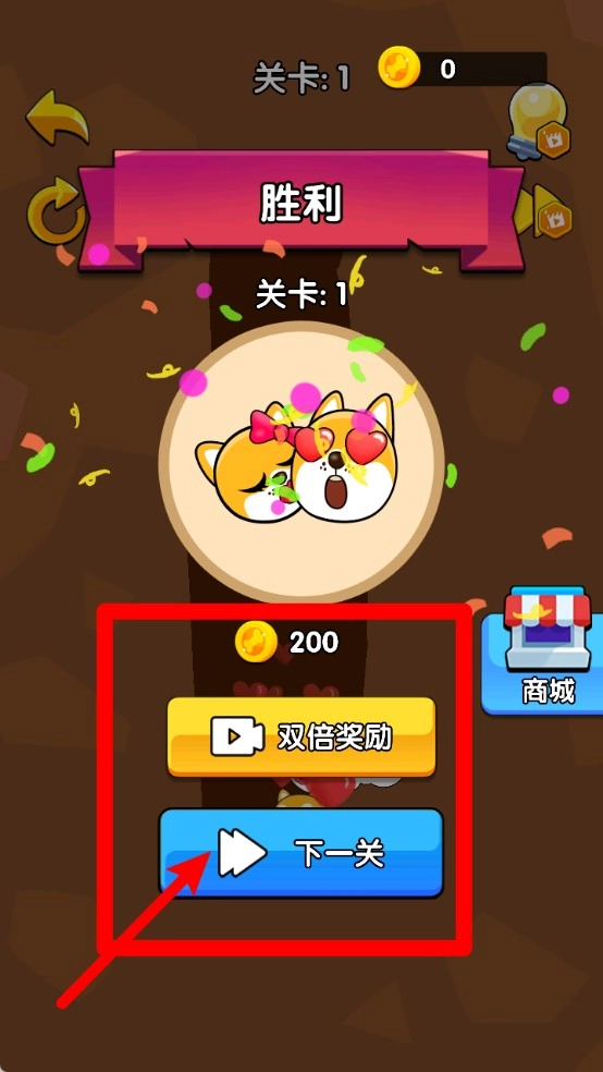 3. 胜利结算页面:当成功通关关卡后,玩家能够领取金币奖励。此外,玩家还能选择观看视频,从而获取双倍奖励,之后点击“下一关”即可继续挑战。