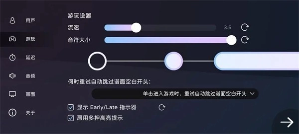 游玩设置模块可以调整流速,音符大小以及重试方式,此外还有指示器和多押提示选项。玩家可以多次调整流速和音符大小来找到自己心仪的配置。