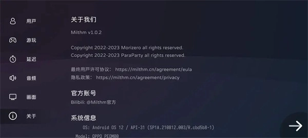 在关于设置界面,玩家可以查看许可协议和隐私政策,以及快速查看系统信息,以便向提交BUG。