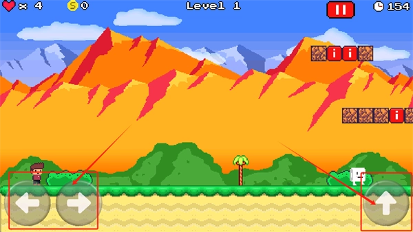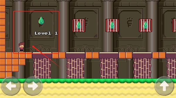3、用底部三个按键控制角色左右移动和跳跃,收集金币和道具闯关。