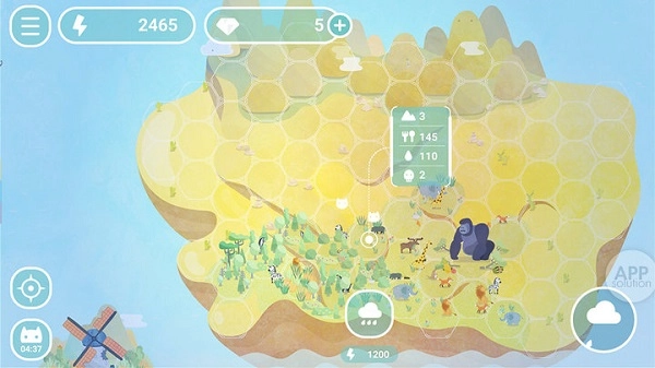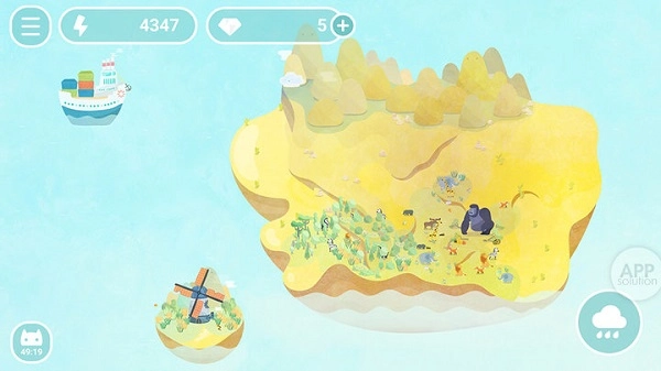 闲来无事时,打开游戏,调节下天气,下丝丝细雨,转动风车获取下雨所需要的能量,给你的小岛带来一片绿衣。每当你发现新物种都会有一份激动吧!如果你偷懒了没有给小岛降雨,那么草原的衰退、动物的灭绝则是对你的惩罚。
