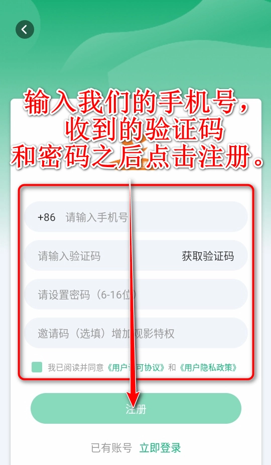 3、输入我们的手机号,收到的验证码和密码之后点击注册。