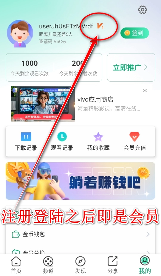 1、在上一个板块我们能发现,橙子视频的会员在你注册之时,便会自动成为V1青铜会员。