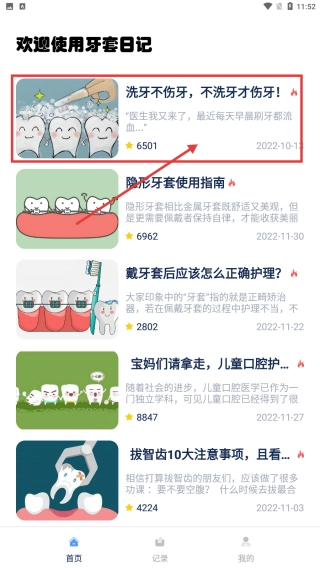 1. 打开首页,翻阅诸如洗牙不伤牙这类口腔护理文章,点击感兴趣的标题,查看具体内容以学习护牙知识。