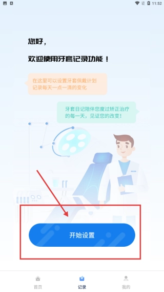 2、切换到记录页,点击开始设置按钮,进入牙套佩戴计划设置流程,记录矫正变化。