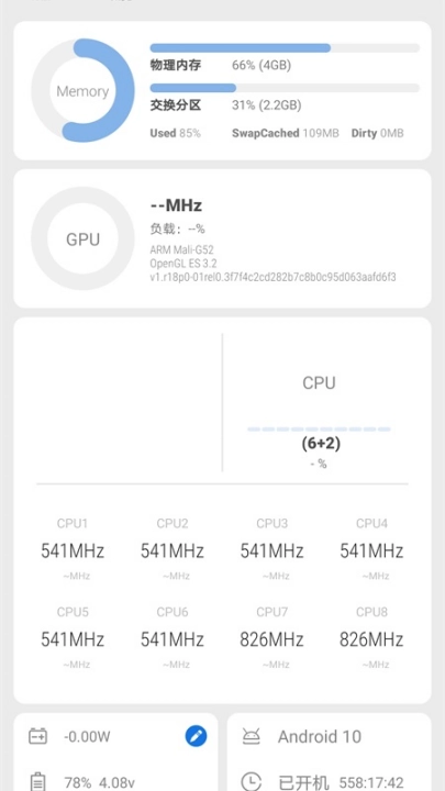 而在概览模块中,用户可以查看手机的物理内存,cpu运行,手机电量、温度、型号以及开机多长时间等信息。