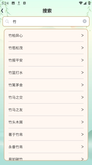 3、输入要查询的成语或关键字,软件自动搜索并显示相关成语。