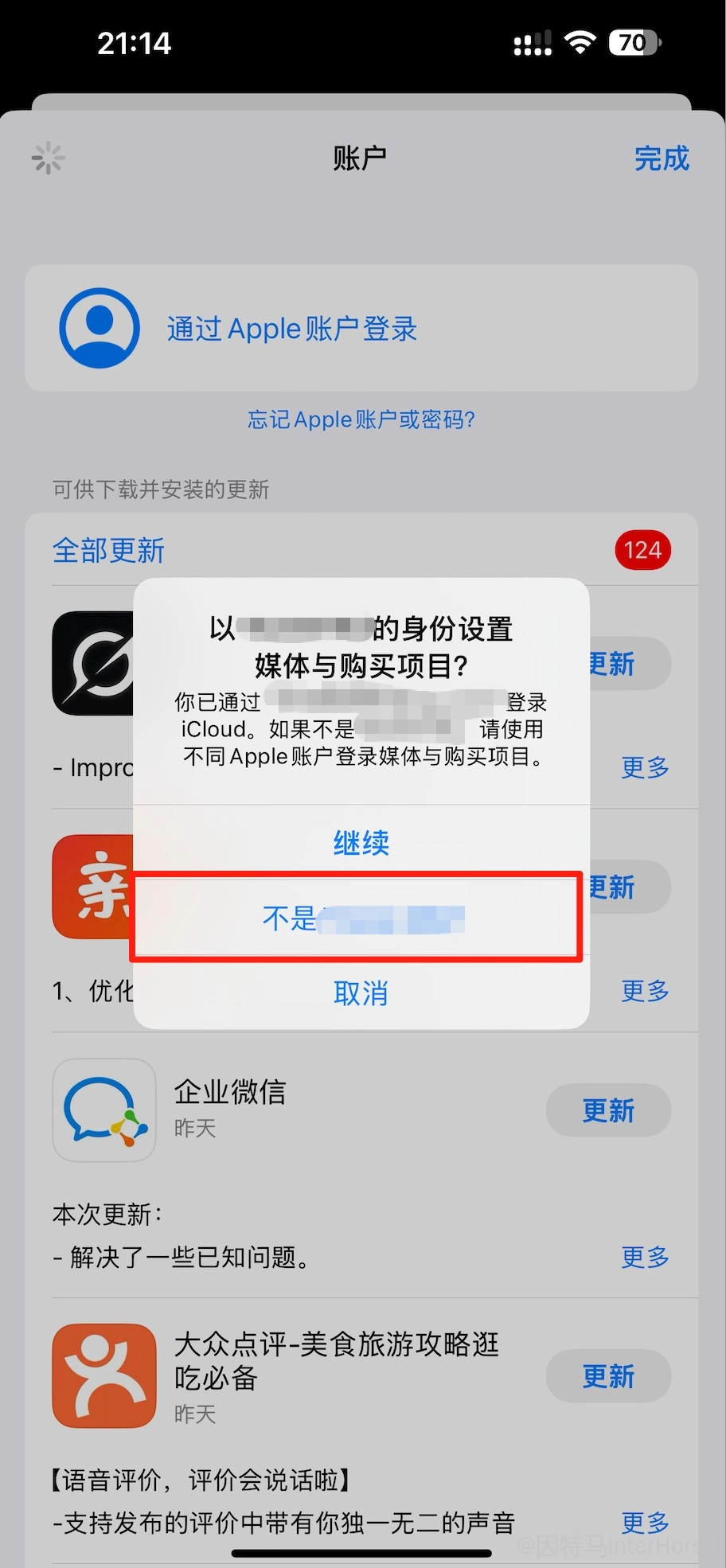 再次点击右上角,选择不是xxx后,输入账户密码登录美区账号。