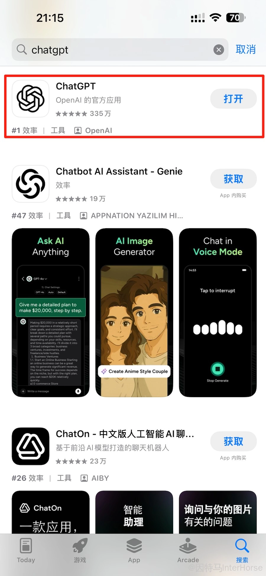 如果有 Google Play,直接在商店搜索 ChatGPT 并安装。
