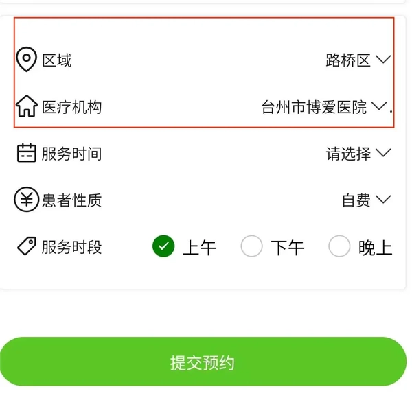 4.选择“台州市博爱医院”或“路北卫生院”或“螺洋卫生院”或“桐屿卫生院”,填写相关信息下单。
