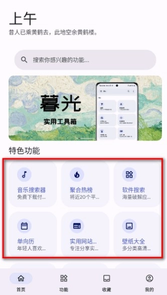 这里有音乐解锁、短视频解析、必应壁纸、电影大全、摸鱼人日历、头像大全、聚合图集解析等各类工具,全方位满足我们各方面需求。不仅操作简便,极易上手,而且干扰,安全绿色,大家可安心使用。