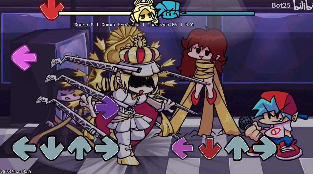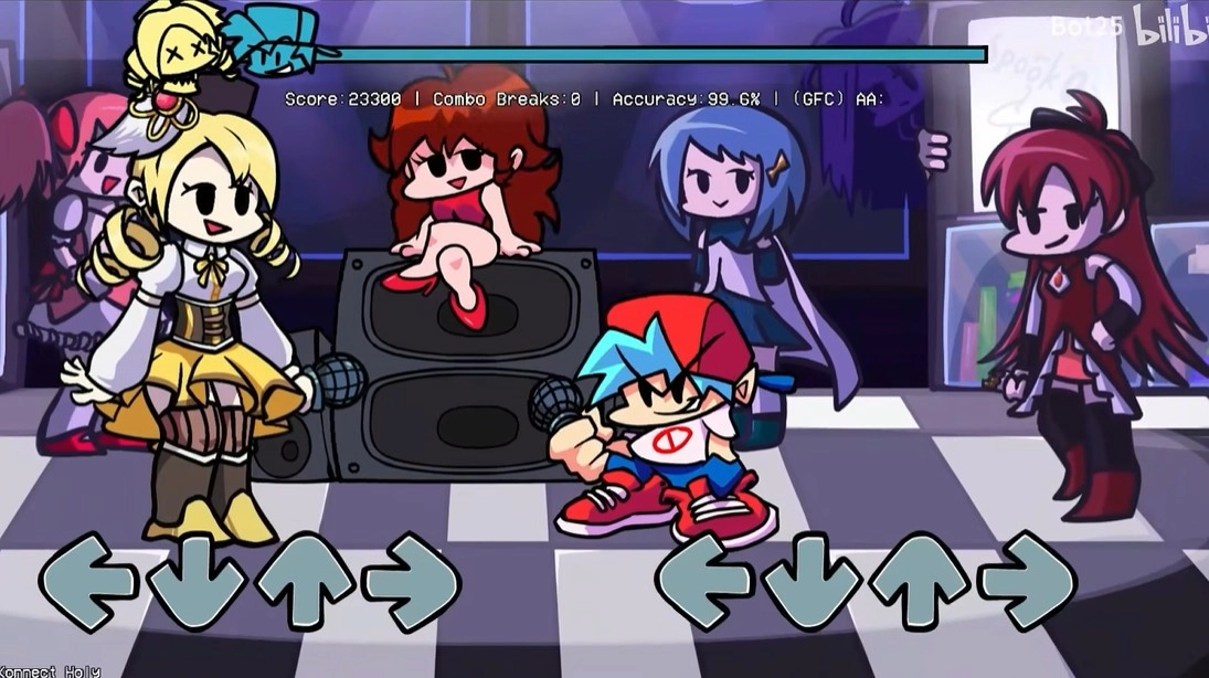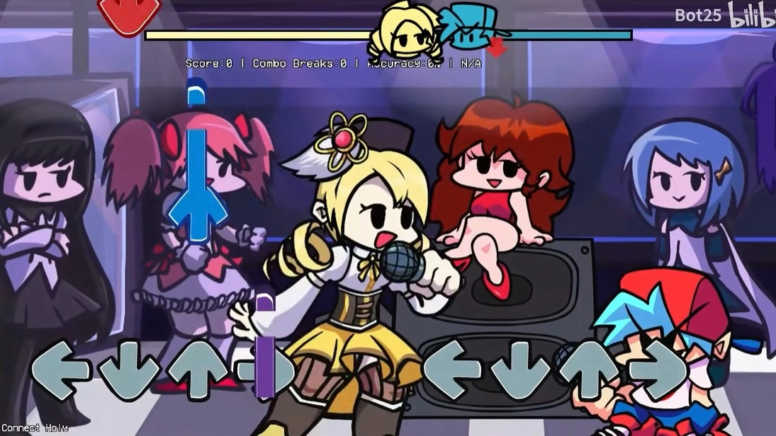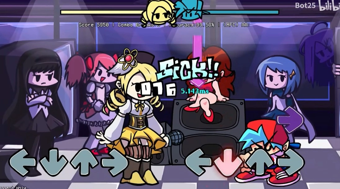 周五夜放克巴麻美模组(FNF:VS 玛米)是一款由玩家自制的音乐节奏闯关游戏。该游戏基于爆火游戏“周五夜放克”,融入了《魔法少女小圆》动漫中的角色——麻美,并且麻美在游戏中作为最终 BOSS 登场,等待着玩家与她在音乐领域展开较量。游戏采用经典的下落式音符节奏玩法,玩家只有准确点击每一个音符才能得分。