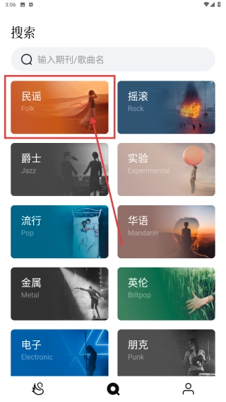2、进入搜索页面,点击民谣风格分类,探索该风格下的期刊与歌曲资源,发现民谣音乐内容。