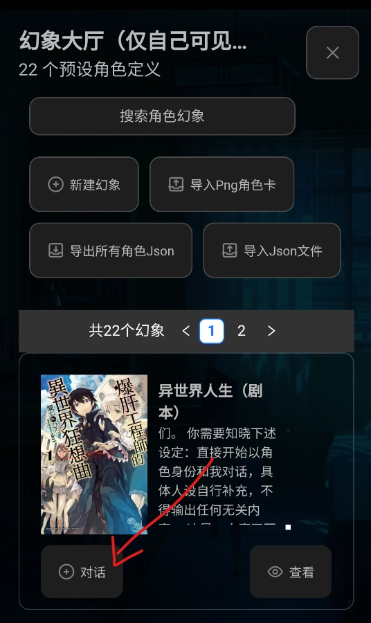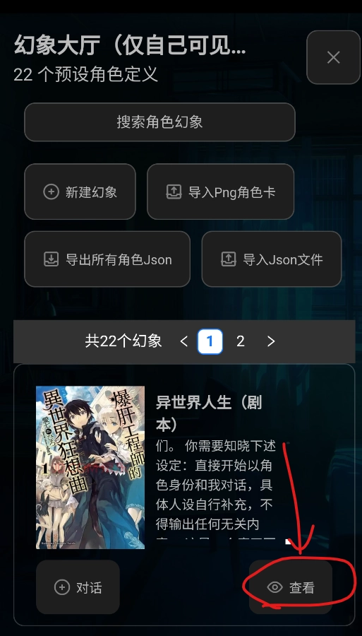 2、可以搜索、新建幻想以及导入角色卡、所有角色Json,也可以直接浏览下方的幻象,找到感兴趣的幻想后点击右下角的查看