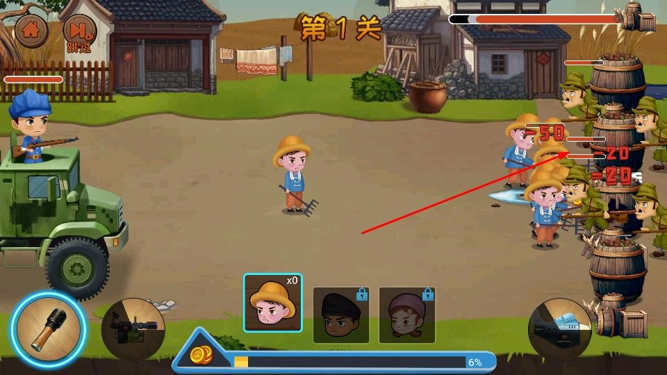 2、在关卡场景后需要操控角色及士兵,利用武器攻击来袭鬼子,合理布置兵力,保卫村庄安全。