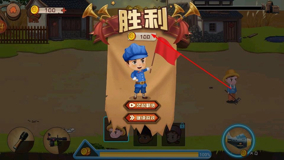 3、战斗胜利后,获取金币奖励可选择奖励翻倍或直接继续游戏,开启下一关挑战。