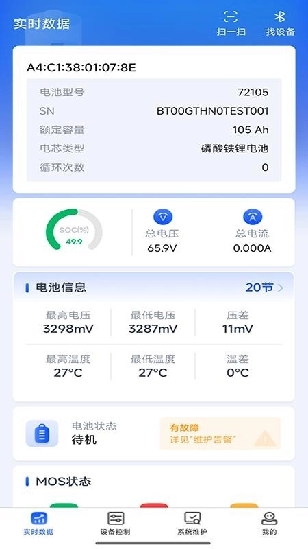 智锂宝简易版,这是一款助力用户便捷管理电池设备的软件。在该应用内,用户可借助蓝牙或者扫一扫的方式,迅速查找并连接设备,从而实现线上管理,实时知晓电池设备的状态,确保使用过程毫无后顾之忧。软件提供详尽的电池设备信息,让用户全面了解电压、温度及温差等数据,有助于设备始终维持正常运行状态。与此同时,用户能够及时在线获取故障信息,方便立即查看,掌握故障详情,并即刻处理。智锂宝简易版还具备设备控制管理功能,通过软件就能对电压、温度和电流阈值进行操作,无需亲临现场,即可轻松完成设置,让设备管理变得更加轻松简便。感兴趣的朋友,快来体验吧!