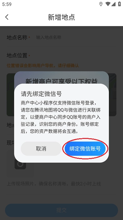 4.这个时候会提示“请先绑定微信号”,因为需要入驻腾讯地图商户中心,点击“绑定微信号”;