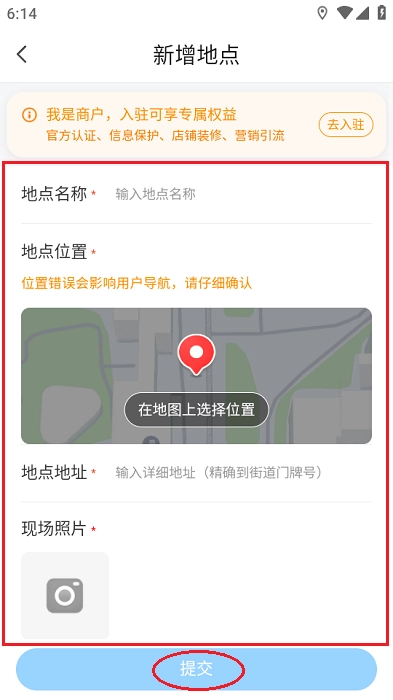 7.最后返回SOSO地图,填写好相关信息,尤其店铺的地点位置不要选错了,不然导航也会是错误的地点,然后点击“提交”,等会审核完成即可!