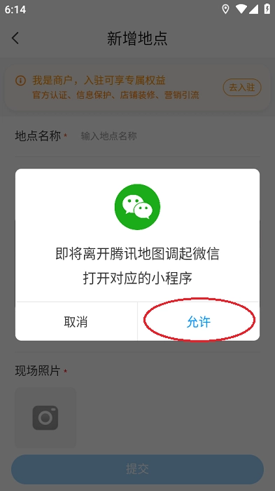 5.会提示“即将离开SOSO地图调起微信打开对应的小程序”,点击“允许”;