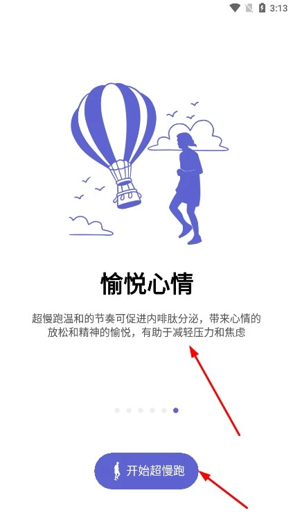 1. 开启一起超慢跑,认识超慢跑在健康瘦身、愉悦心情等方面的优势,点击“下一页”,着手进行超慢跑,进入功能页面。