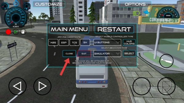 1. 于游戏的设置弹窗内,需点击“CLOSE”按钮,关闭设置界面,返回至巴士的驾驶操作页面。
