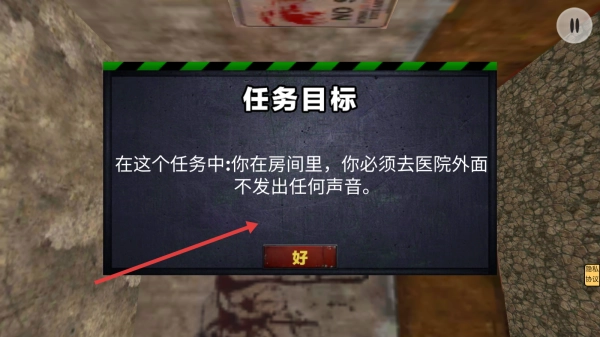 3、在场景中,会出现任务目标提示,需按照提示内容,在房间里行动时不发出任何声音,前往医院外面,完成任务推进进程。