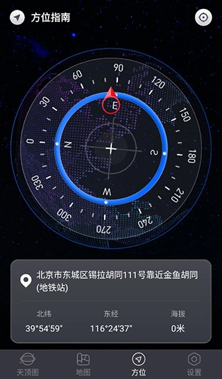 用户在方位页面可以查看自己当前的方向位置以及经纬度,点击右上角瞄准图标可以进行水平校准。