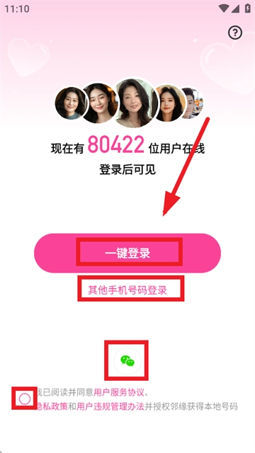 请勾选“我已阅读并同意用户服务协议、隐私政策和用户违规管理办法”,同时授权邻缘获取本地号码。您可从一键登录、其他手机号码登录、微信授权登录这三种方式中任选其一进行登录。