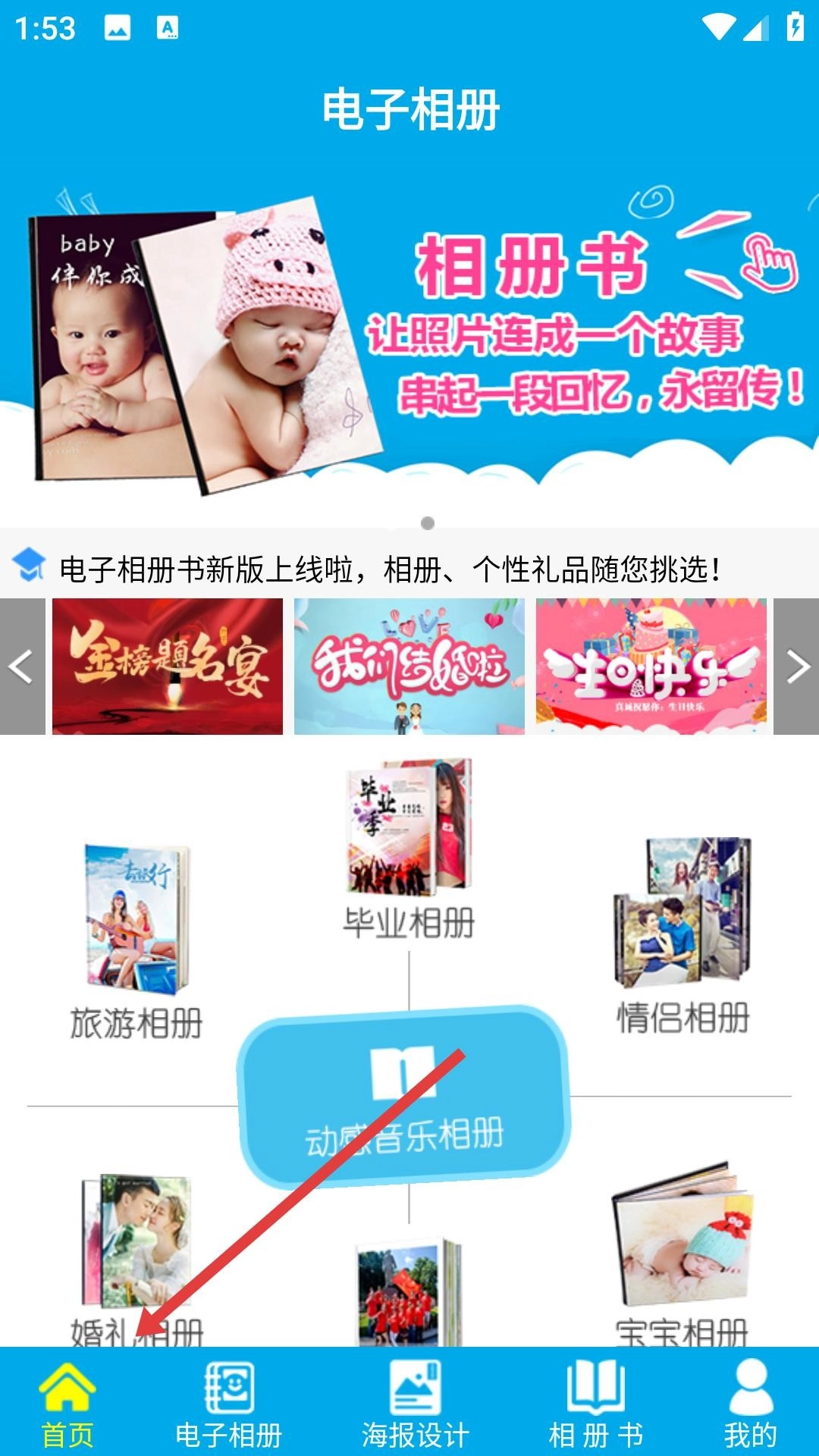 1. 在首页界面,设置了毕业相册、旅游相册等丰富多样的相册类型入口,同时配备动感音乐相册板块,助力用户轻松制作各类不同主题的电子相册。