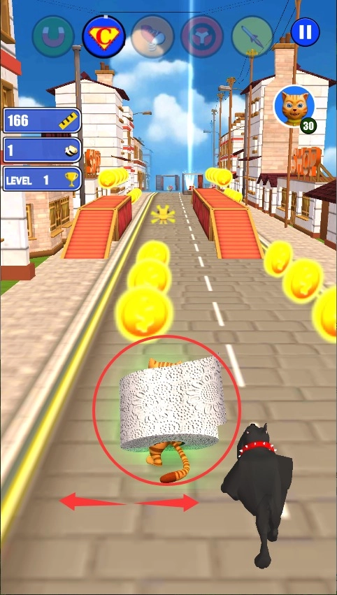 2、手指左右滑动屏幕控制猫咪移动,注意避开路上的障碍物,撞到东西就会把卫生纸缠住导致失败。