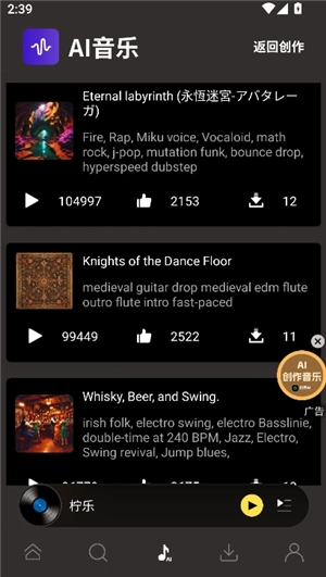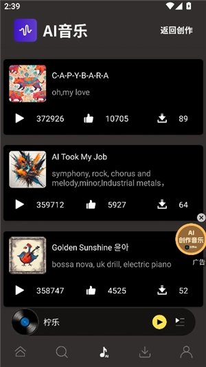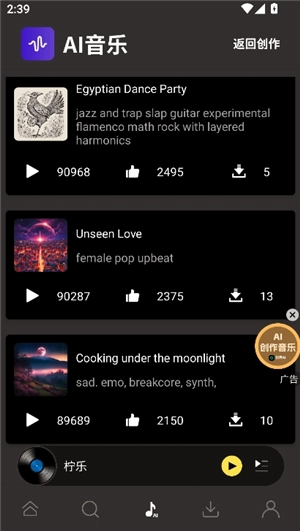 柠乐音乐2025,一款备受欢迎的免费音乐播放软件。它汇聚了全球海量热门曲库,你能够随心所欲地搜索各类主题的优质歌曲进行收听。不仅如此,该软件还搭载先进的AI音乐技术,只需输入歌曲名称、歌词或音乐风格,AI就能一键生成原创佳作,让每一位音乐爱好者都有机会化身大师级创作人。感兴趣的小伙伴,快来柠乐音乐2025体验一番吧!