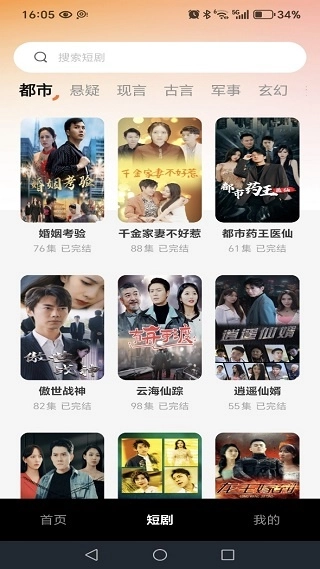 1、能按名称、类型、演员等搜索,同时内容精细分类,用户按题材、地区等维度能快速定位想看的短剧