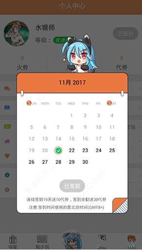 2、每天进行签到之后就能获得5点代券,可以用这个代券来看书。一般来说签到2天可以免费看一章vip,连续签到15天额外赠送10代券,30天赠送30代券。