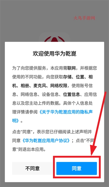 安装并打开华为乾崑,在欢迎使用华为乾崑提示界面点击同意