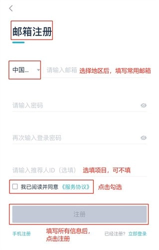 2、点击邮箱或者手机注册,以邮箱注册为例,填写常用邮箱,地址选填中国内地,设置并确认密码,(推荐人那一栏为选填可以不写)。阅读并点击同意服务协议,点击注册即可进入邮箱验证码页面。