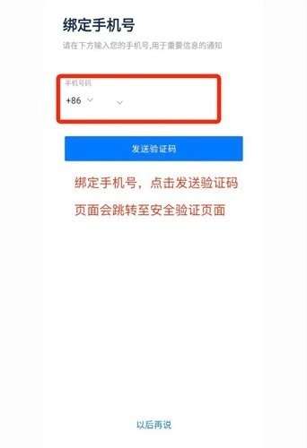 4、绑定手机号,点击发送验证码,页面会跳转至安全验证页面(也可选择以后再说)。