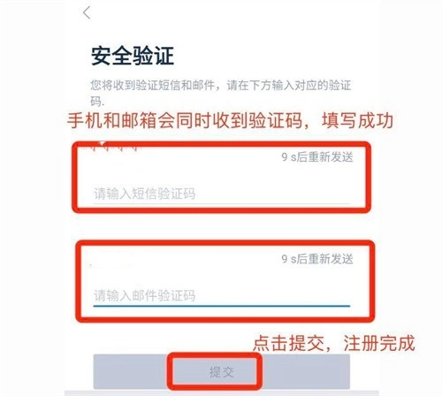 5、手机和邮箱会同时收到验证码,填写验证码之后,点击提交注册完成,注册完成即可登录进行交易。