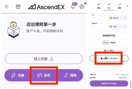 首页中部点击【买币】进入买币操作页面,选择【第三方平台】支付方式。